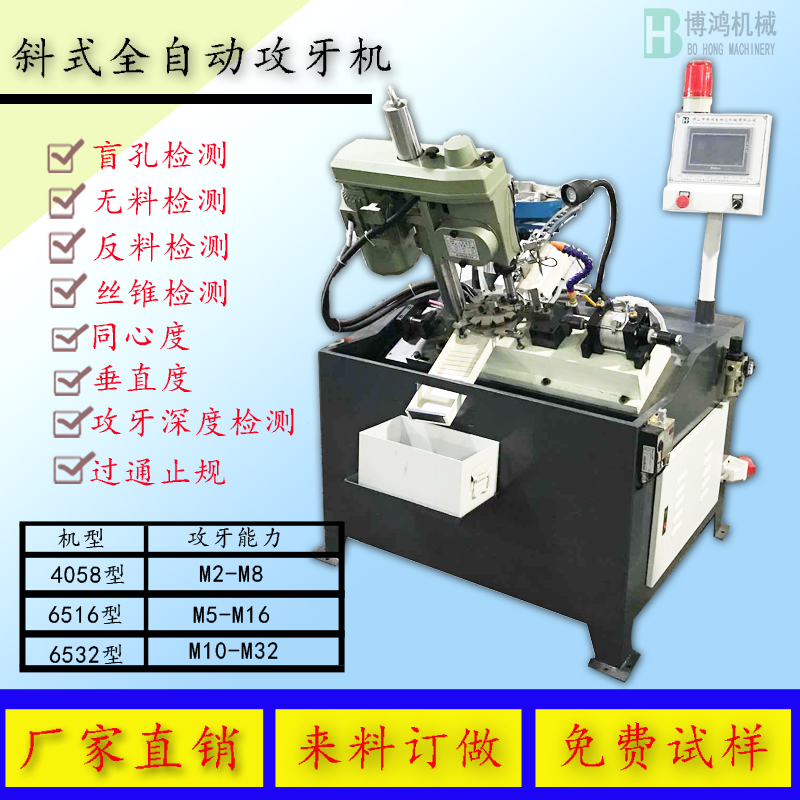 二、要了解有關(guān)攻絲機(jī)的能攻最大值是多少,一般要求是45號(hào)鋼,而且攻絲時(shí)深度要達(dá)到絲錐直徑的兩倍,并能一次性完成整個(gè)的攻絲過程。